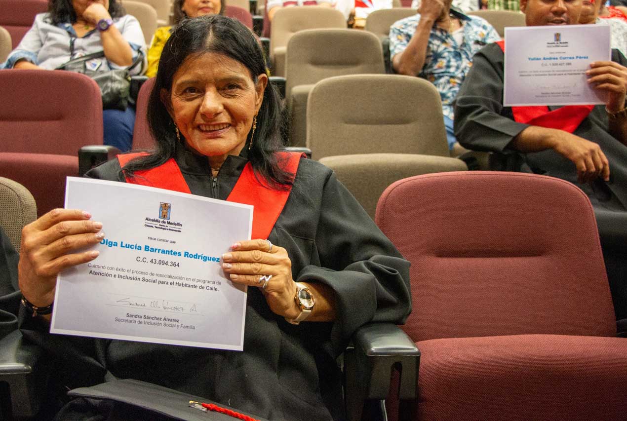 “Desde la Alcaldía de Medellín nos sentimos muy afortunados de presenciar este momento porque son personas que han venido trabajando en el ser, para poder reencontrarse de nuevo con esa persona que está en su interior y que los lleva a nuevos rumbos en su vida”, dijo la subsecretaria de Grupos Poblacionales de la Secretaría de Inclusión Social y Familia, Clara Vélez.