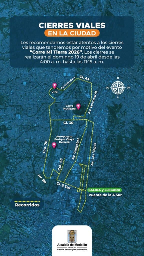 Estos son los cierres viales que tendrá Medellín el domingo por la carrera Corre Mi Tierra 2026