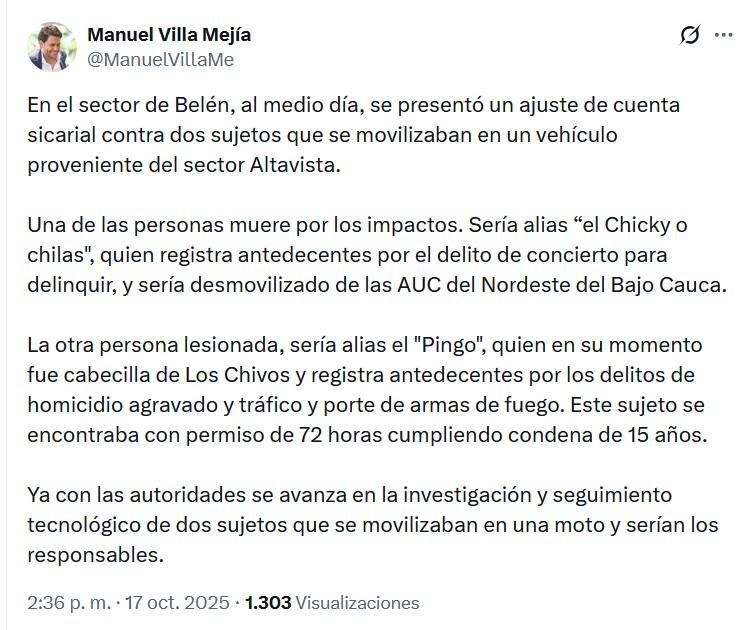 El secretario de Seguridad de Medellín confirmó la identidad delincuencial de las dos víctimas del ataque sicarial ocurrido en Belén este 17 de octubre.