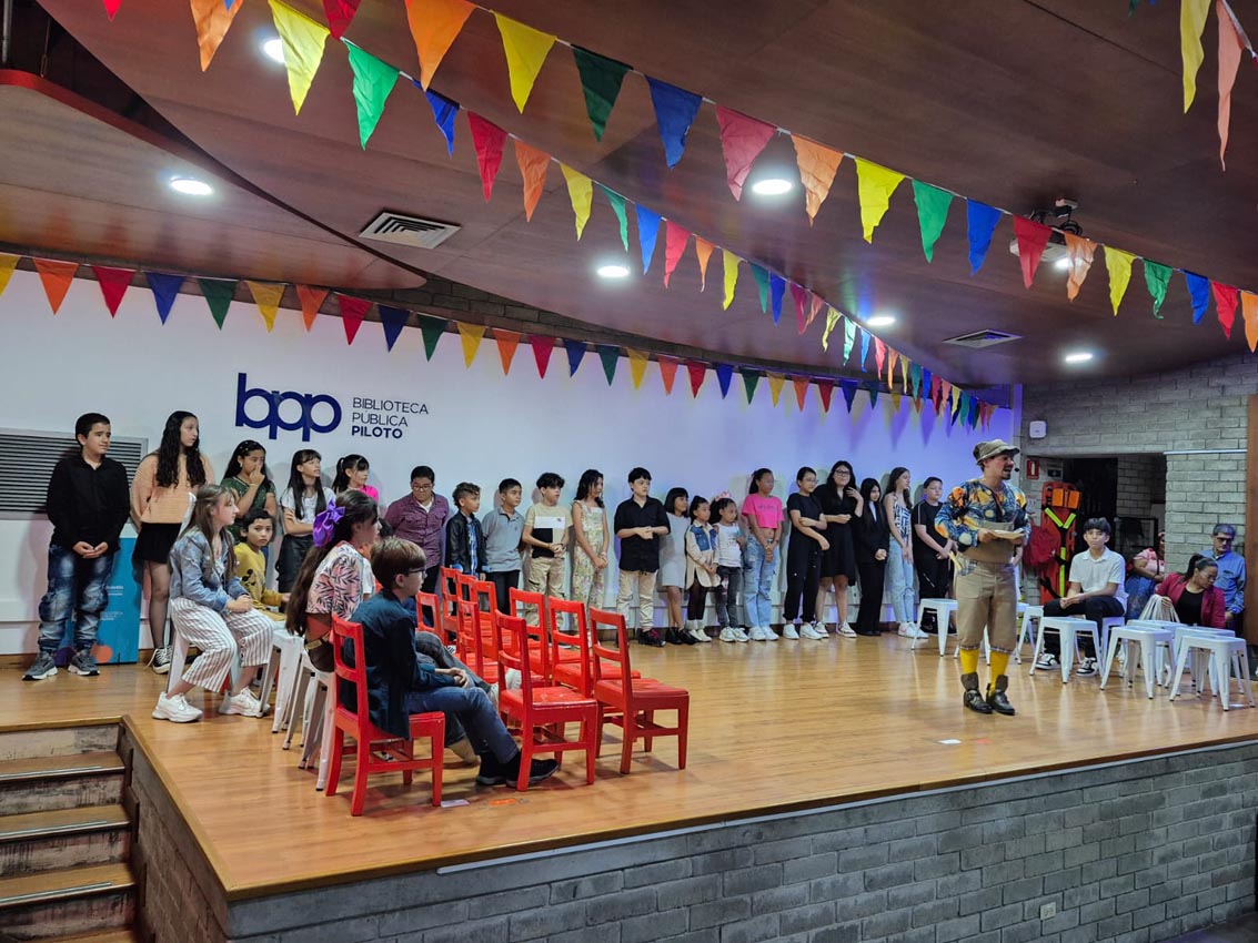 Biblioteca Pública Piloto y niños participantes en el Concurso de Cuento Infantil Pedrito Botero.